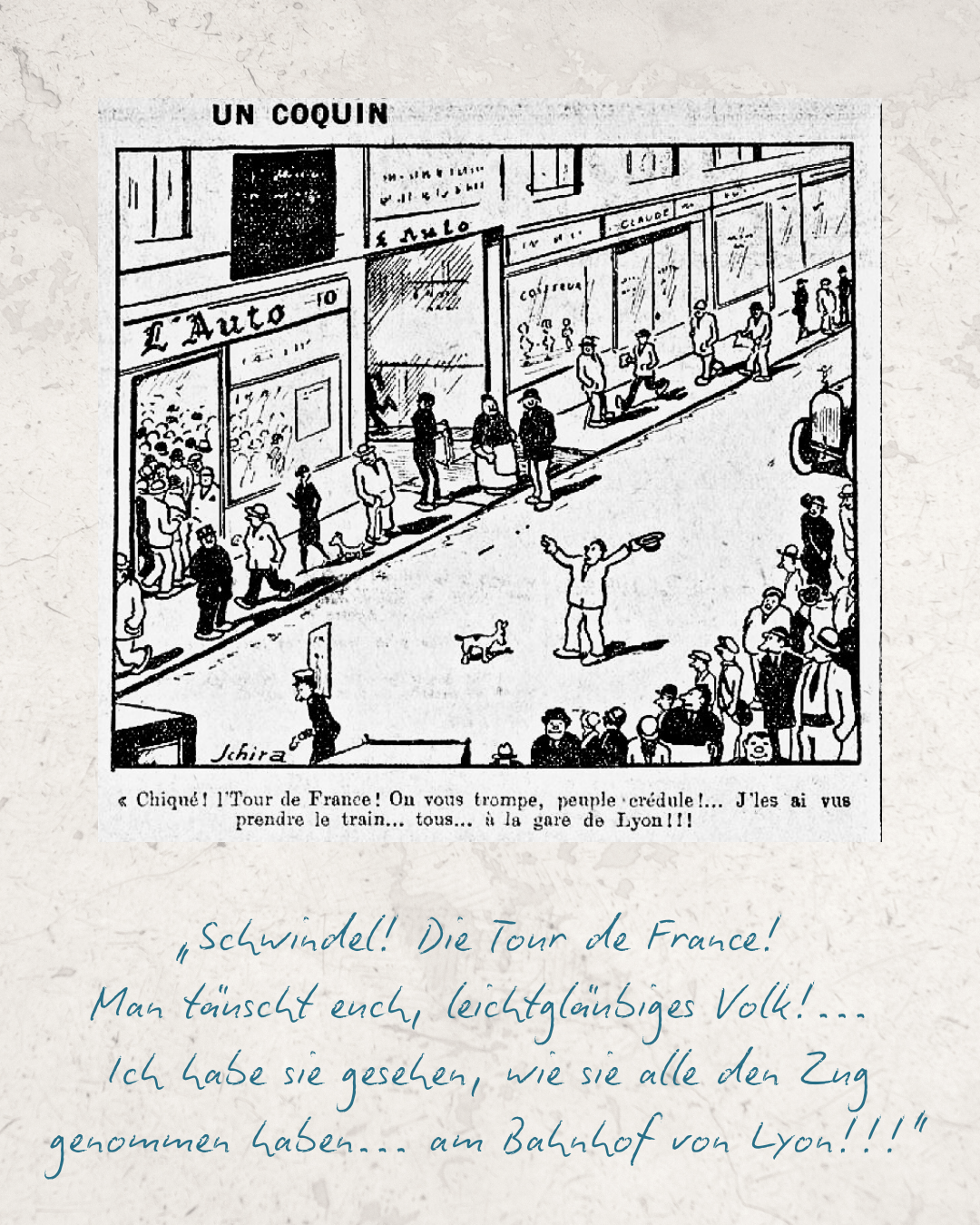 Und Ottavio Bottecchia? Der Journalist Gonnet berichtet uns, dass Bottecchia einen Tag zum Vergessen erlebt habe: Mehrere Plattfüße, dazu Magenprobleme während der ganzen Etappe und schließlich 34 Minuten Rückstand im Ziel. Seinen Teamkollegen versicherte er im Ziel, dass seine Zeit während dieser Tour de France schon noch kommen werde. Henri Desgrange zeigte dafür wenig Verständnis. In seinem Zeitungsartikel machte er sich geradezu lustig über Bottecchias Fahrweise: „Wenn Sie mir erklären können, was da nur in Bottecchias Birne vorgegangen ist, dann schenke ich Ihnen ein lebendes Kaninchen.“ Sagen wir es so: Desgrange war vermutlich besonders stolz auf seine Streckenplanung und freute sich insgeheim, dass der Hauptfavorit scheinbar in die Falle getappt war, indem er die Etappe zu schnell angegangen war. Abgesehen davon war Desgrange aber auch bekannt für seine markigen Worte, damit musste jeder klar kommen!