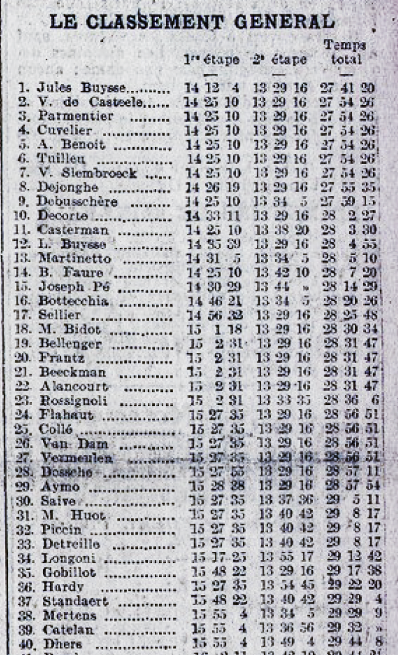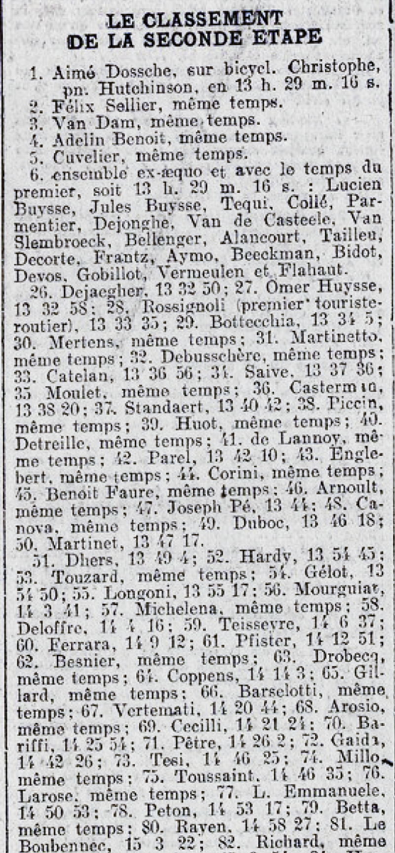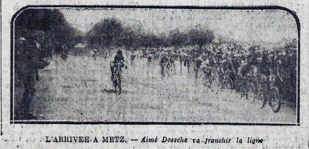 Ein wenig belebt wurde das Rennen in den Nordvogesen dann doch noch. Gerade an der 10% steilen Rampe von Lembach hat Lucien Buysse, der Bruder des Mannes im Maillot Jaune und einer der großen Favoriten, einen Plattfuß. Er fand schnell wieder Anschluss und attackierte sogar am nächsten Anstieg! Nach und nach gab es immer mehr Tempoverschärfungen, wie bei einem Ausscheidungsfahren. Schließlich waren es noch 25 Fahrer, die an der Spitze liegend die Stadtgrenze von Metz erreichten. Jules Buysse als Gesamtführender hielt sich clever aus allen Gefahren heraus. Im Sprint siegte der 24-jährige Belgier Aimé Dossche vom Team Christophe-Hutchinson. In der Gesamtwertung gab es keine nennenswerten Veränderungen. Die Favoriten um Ottavio Bottecchia, Nicolas Frantz und Lucien Buysse hatten keine Zeit aufholen können.